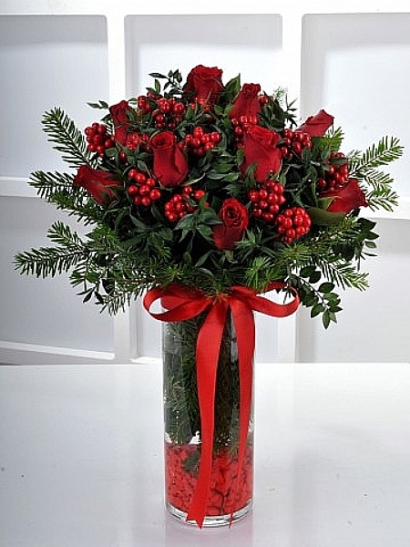 Cam vazoda 9 Adet Kırmızı Gül ve 12 Adet Kokina Yılbaşı Şans Çiçeği